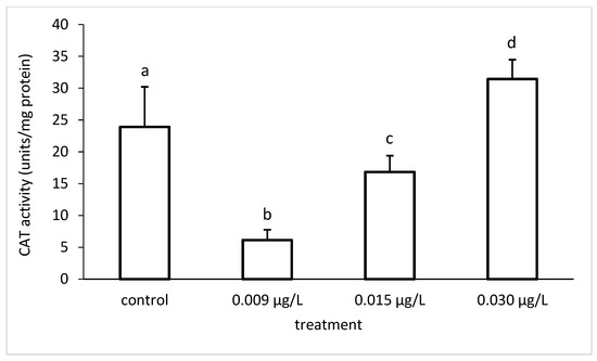 Catalase (CAT) activity in common carp liver under different CPF exposures. Bars represent means ± SD of the control and experimental groups. Different letters indicate significant differences among treatments (p < 0.05).