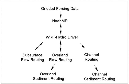 The structure and schematic representation of WRF-Hydro-Sed are shown in Figure 1; Figure 2, respectively. WRF-Hydro is an integrated modeling platform that incorporates a land surface model (LSM), grid aggregation/disaggregation, subsurface flow routing, surface overland flow routing, channel routing, lake and reservoir routing, and a conceptual base flow model. In this study the soil erosion and sediment transport processes are built on WRF-Hydro’s overland flow and channel flow routings.