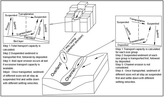 As shown in Figure 2, sediment is first eroded from and transported through overland area by surface runoff. At the beginning of each time step, the total transport capacity is calculated with the revised USLE [] over upland area. With the transport capacity, the suspended sediment is transported first, followed by the deposited part. At last, if there is still transport capacity left (excessive transport capacity), it will be used to erode the bed layer. During these processes, both the wash load and bed load transportation are considered. The different treatment of transport of the fine materials as wash load and coarse materials as bed load are achieved mainly by assigning different settling velocities to different sediment size groups.