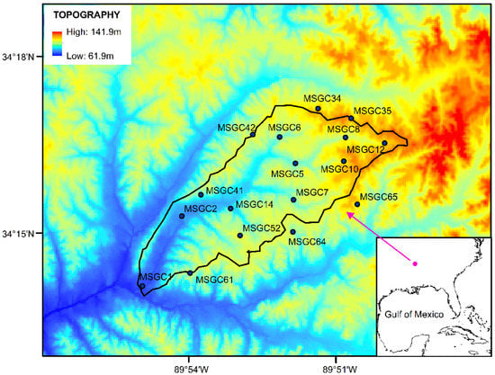 Topography of Goodwin Creek Experimental Watershed (GCEW) and gage location (DEM data source: National Hydrography Dataset Plus (Version 2), []).