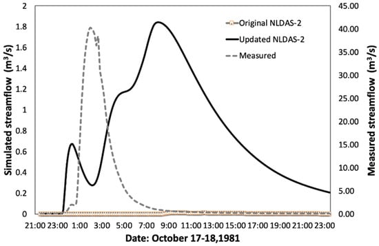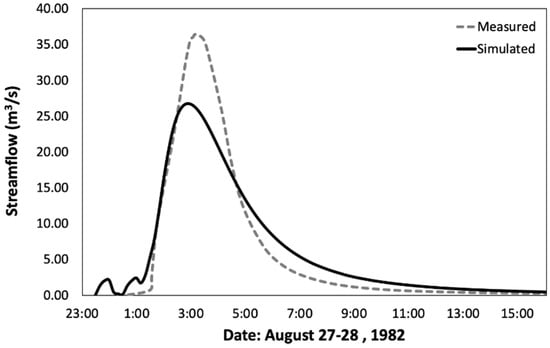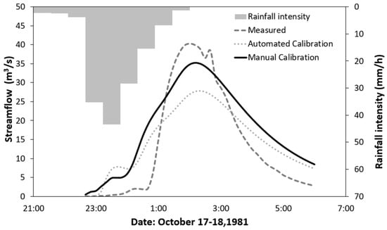 Streamflow was calibrated for a 3-year rainfall event on 17 October 1981 (calibration event hereafter), which started at 21:19 and lasted for approximately five hours. The average rainfall intensity is 14.7 mm/h and total rainfall is 74.4 mm. Calibrated hydro-parameters were selected based on sensitivity analysis and previous studies [,,].