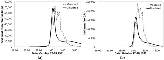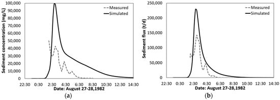 The comparison between simulated and measured sediment concentration and sediment flux is shown in Figure 7. The model can catch the shape of the observed sediment graphs but with an overall overestimation for both sediment concentration and flux. Sediment flux is better simulated than sediment concentration with NSE and KGE 0.09 (vs. −2.26 for concentration) and 0.34 (vs. −0.15 for concentration), respectively. A comparable model performance in sediment concentration simulation is also reported by Elliot [], which was partially attributed to the fact that simulation of sediment concentration involves an error in both sediment simulation and runoff simulation. Due to the absence of observation data before 2:00, 28 August 1982, it is impossible to calculate the sediment yield during the entire event. Yet it is reasonable to assume that the real sediment yield is larger than the estimation based on the available data (9100 t). Thus, we consider that our model-simulated sediment yield (14,950 t) is acceptable.