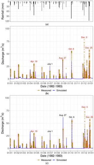 Figure 10b shows the simulated and observed streamflow during 30 rainfall events of 1982, with the calibrated hydro-parameters from Section 3.3. Overall, with the calibrated hydro-parameters based on one single event (calibrated hydro-parameters hereafter), the model can reproduce all the streamflow events in the year with an NSE value of 0.43. However, simulation underestimates the streamflow mainly during the heaviest rainfall events of the year, i.e., rainfall events of 19 April, 6 October, 3 and 25 December, while overestimation can be found during less intense rainfall events such as that of 1 July. This indicates that the calibrated hydro-parameters based on one single event might favor the calibration event itself, while they are less suitable to fully reproduce hydrographs over events that have much different rainfall characteristics. In this case, we recalibrated the streamflow on the 30 rainfall events of 1982 (recalibrated hydro-parameters hereafter) with the observed streamflow to investigate how much the model performance can be improved through the multiple events recalibration. In addition, the calibrated hydro-parameters can be better evaluated by comparing them to the recalibrated hydro-parameters in terms of model performance improvement.