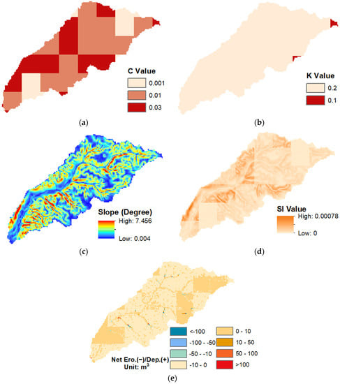 In this study, C and K values are calibrated over GCEW manually. Topographic slope is calculated using ArcGIS on the digital elevation grid of the study area with a resolution of 50 × 50 m. Then the SI is calculated over GCEW following Equation (13). Furthermore, we analyzed the relationship between SI and the magnitude of the soil erosion simulated by our model during the calibration event. Figure 11a–d shows the spatial distribution of C, K, slope and SI over GCEW. Figure 11d exhibits the net erosion and deposition over the study area during the calibration event.