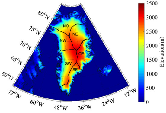 The Greenland Ice Sheet (GrIS) (Figure 1) covers an area of 1.71 million km2 (we note that the total area of Greenland is 2.1 million km2), representing an ice volume of 2.85 million km3 [1]. The understanding of the GrIS mass balance plays a key role in studies of sea level change, global water cycle, and other issues associated with climate changes [2,3]. Due to a lack of in situ measurements, satellite remote sensing techniques have primarily been used to monitor GrIS changes. These techniques involve radar altimetry (the Ice, Clouds, and Land Elevation Satellite (ICESat) mission and CryoSat-2) [4,5,6,7], microwave radar (Cryosat, ERS-1/2, Envisat, Geosat, etc.) [8,9], satellite gravity (the Gravity Recovery and Climate Experiment (GRACE)) [10,11,12,13], and Global Navigation Satellite Systems (GNSS, such as GPS) [1,14,15,16].