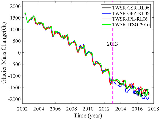 As stated above, after replacing the low-degree terms, applying spatial filters, and correcting the leakage and GIA effect to the GRACE solutions, we obtained the monthly mass changes of the GrIS. The total mass change (TWS-R) of the GrIS represents the sum of mass changes in each grid point in GrIS. We analyzed the monthly GRACE estimates from four different centers. As seen in Figure 2, these solutions do not differ significantly before 2013. Unfortunately, the GRACE observations deteriorated since 2013 due to aging of instruments on satellites. This resulted in large differences between individual solutions caused by differences in the processing strategies, including differences in the introduced models and inversion methods. To mitigate the uncertainties of individual GRACE solutions from the GFZ, CSR, JPL, and ITSG processing centers, we used a simple average of these four solutions.