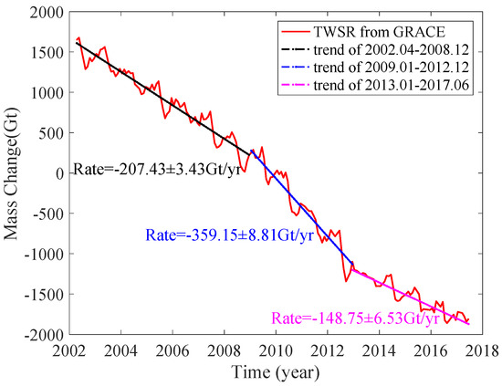 As seen in Figure 2, the rates of mass change before and after 2013 differ, partly due to the aforementioned reasons. Apparent transient changes during the entire time span exist. To get a long-term trend, we first deducted the annual and semi-annual terms and 161-day cyclical fluctuations (which is due to GRACE tidal alias period for S2) in time series using Equation (1). Then, we used the R Package (segmented) software to estimate the regression models with unknown break points of the time series of mass change [42]. It allows estimating linear and generalized linear models (and virtually any regression model) having one or more segmented relationships in a linear predictor [43]. Figure 3 shows the time series of the GrIS mass changes (obtained based on averaging solutions from four processing centers) divided into three segments: from April 2002 to December 2008, from January 2009 to December 2012, and from January 2013 to June 2017. The rate of mass changes during the period of rapid melting from April 2002 to December 2012 is −207.4 ± 3.4 Gt/yr. From January 2009 to December 2012, the ice sheet melted even faster, at the rate of −358.2 Gt/yr. From January 2013 to June 2017, the melting rate slowed down to only −148 Gt/yr due to the influence of atmospheric circulation in the northern hemisphere. This finding could be verified by published results that indicate a growing trend of glaciers in Greenland in recent years. The Jakobshavn glacier, for instance, has been Greenland’s fastest-flowing and fastest-thinning glacier for the last 20 years. It is now flowing more slowly, thickening and advancing towards the ocean, instead of retreating further inland [44].