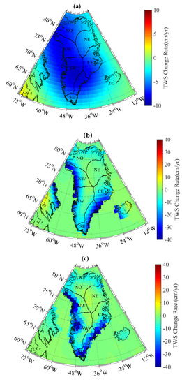 The apparent mass change rates derived from GRACE with low-degree terms correction and spatial filters, but without the leakage effect correction, are shown in Figure 4a. Figure 4b shows the recovered mass change rates derived from the monthly recovered water storage changes after applying a forward modeling technique to the monthly water storage changes. We note that a detailed explanation of the forward modeling technique can be found in [34]. To validate the forward modeling results, we estimated the GrIS mass change rates by applying the GRACE CSR RL05 mascon solution [45]. This result is shown in Figure 4c. As seen in Figure 4a,b, the leakage effect to GRACE results is significant. After applying the forward modeling technique to reduce the ocean-land leakage, we observe considerable changes in the spatial distribution pattern of mass change rates. The forward modeling and mascon solutions exhibit similar spatial patterns (Figure 4b,c). Before applying the leakage correction (Figure 4a), due to the use of truncation and filtering methods, the mass loss occurs mainly in the northwest and southeast parts of Greenland, including the south inland area, with mass changes at the rate varying from −10 to about −5 cm/yr. After applying the leakage correction (Figure 4b), the mass ablation signal leaking to the adjacent ocean and inland ice sheets in the southeast and northwest coastal regions are characterized by many overflowing glaciers and fast ice flow rates. Along the southeast and northwest coastal regions, the mass ablation reached an alarming rate of −20 cm/yr, with some localized mass changes even reaching −30 cm/yr. Despite the mass change decreases along the northern coast, the trend kept at about 15 cm/yr. The mass change rate inland is significantly smaller than that detected along coastal regions. Coastal areas are also experiencing a more rapid decrease in total mass. The ocean-land leakage thus represents about 40% of the GRACE total signal.