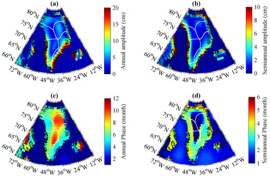 We see that the semi-annual amplitude along the west coast is larger than that along the east coast. This pattern differs from a spatial distribution pattern of the annual amplitude. Figure 5c,d shows the annual and semi-annual phase changes in the mass of ice and snow. Overall, the mass accumulation reaches the maxima in May and June, followed by the mass ablation until September and October. The phase (in Figure 5c,d) indicates in which month the mass reaches the maxima. As seen in Figure 5c, the mass along the coastal areas in the southeast and west reaches the maxima between June and July, while inland ice mass reaches the maxima between October and December. This pattern is explained by the fact that inland the annual temperature is mostly below 0 °C [46,47]. Hence, the total mass budget there largely reflects a snow accumulation, while the contribution of ice discharge is minor. The total mass thus reaches the maxima (June−July) in coastal areas before reaching the maxima inland (October−December).