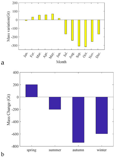GrIS: (a) monthly and (b) seasonal mass variations estimated based on averaging the GRACE monthly solutions from four processing centers between April 2002 and June 2017 and after applying the forward modeling technique to suppress the ocean-land leakage effect. The values represent the monthly and seasonal average over the investigated period.