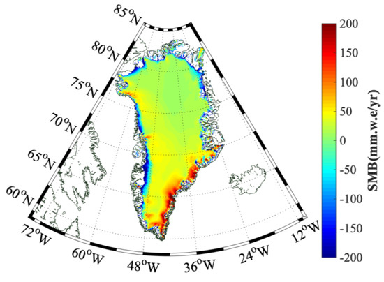 To complement the above deficiencies of each of these techniques [25,26], uncertainties could partially be mitigated by their combined usage. In this study, we used only the first two methods (described above) to obtain a comparative analysis and cross-validation while disregarding the third method that uses altimetry data. Because the elevation changes in the ice sheet measured by altimetry could be converted into corresponding mass changes based on adopting a density model of ice/snow. Unfortunately, the large uncertainties in the adopted density model introduce large errors in the estimates of ice mass changes. The modeled SMB variations need observational validation, such as GRACE. This is because the space-geodetic data do not exclusively reflect the SMB, but also ice dynamics, glacial isostatic adjustment, and other phenomena. Mass changes in the GrIS can be caused by variations in the glacial dynamic mass balance (ice discharge) and the SMB. However, the GRACE observations cannot directly separate these two physical causes, as they detect the sum of entire mass changes with a limited spatial resolution (around 330 km at the equator). The GrIS inter-annual variations are mainly attributed to SMB fluctuations that can be estimated more accurately by using a high-resolution SMB model, such as the SMB model RACMO2.3p2 [27] provided with a 1 km resolution that is used in this study.