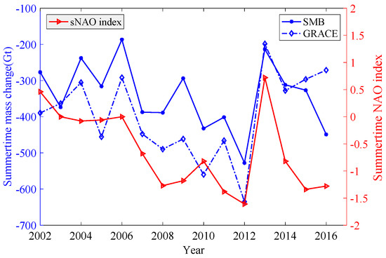 Our results indicate that a continuous mass loss in Greenland is mainly attributed to the melting of ice sheets in summer. We found throughout 15 years that the largest mass loss occurred in 2012, while the smallest mass loss was detected in 2013. Therefore, we further focused our analysis on the summer mass loss caused by climate change. The North Atlantic oscillation (NAO) index is an important atmospheric indicator reflecting the state of the general atmospheric circulation over Greenland. It has been shown to be connected to extreme melting events in Greenland [51,52,53]. We used the monthly tabulated NAO index from the National Oceanic and Atmospheric Administration (NOAA) (https://www.ncdc.noaa.gov/teleconnections/nao/) that is standardized by the 1981–2010 climatology. By analyzing the relationship between these investigated phenomena of mass changes from GRACE and SMB-D and NAO index, we were able to understand better the mechanism of how climate changes influence the GrIS mass. As seen in Figure 8, the negative phase of the summertime NAO (sNAO) index (June-July-August), such as in 2008 and 2012, increased the prevalence of high pressure, enhancing the surface absorption of solar radiation and decreasing precipitation. It caused the migration of warm air from southern latitudes into western Greenland. These changes promoted higher air temperatures, a longer ablation season, and enhanced melt and run-off. The positive phase of the sNAO index, such as in 2013, increased precipitation and decreased air temperatures, leading to a shorter ablation season and smaller mass loss. An increased mass loss has been related to increased occurrences of the negative phases of NAO during summer, which favors an anticyclonic circulation at upper levels and warmer conditions over Greenland at lower levels through the advection of warm air along its western coast. NAO is a large-scale climate driver, and it influences mass changes in Greenland by controlling regional temperature, precipitation, and atmospheric circulation. We also found that the highest summer temperature of Greenland was in 2012 over the whole investigated period of 16 years, and the amount of precipitation after 2013 was higher than in previous years. This explains, to a large extent, why in 2013 we detected a slowdown in the mass loss. As seen in Figure 8, the largest mass loss in Greenland occurred in 2012, which was followed by the smallest loss in 2013.