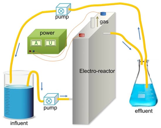 In this recycling system, one peristaltic pump (Youji Keyi ZQ000S, Baoding, Hebei, China) was used to pump the influent RhB wastewater from a beaker into the bottom of the electro-reactor. Then the RhB wastewater flowed out from the upper outlet of the electro-reactor and was collected in an Erlenmeyer flask. Simultaneously, the other peristaltic pump was used to pump the effluent RhB wastewater from the Erlenmeyer flask back to the beaker.