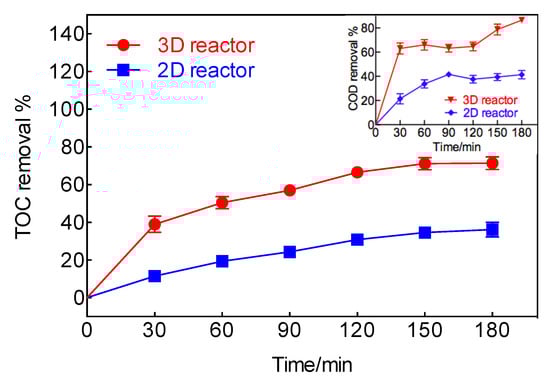 As shown in Figure 2, the TOC removal of RhB wastewater in the recycling-flow 3D electro-reactor system was always higher than that in the recycling-flow 2D electro-reactor system, and the highest TOC removal was 72.0%, which was 1.98 times that in the recycling-flow 2D electro-reactor system (36.3%). From the perspective of COD, the COD removal of RhB wastewater in the recycling-flow 3D electro-reactor system was much higher than that in the recycling-flow 2D electro-reactor system and the highest COD removal was up to 86.9%. By the 30th minute, COD removal in the recycling-flow 3D electro-reactor system had already reached 63.4%, meanwhile, the recycling-flow 2D electro-reactor system just reached 41.9% by the 180th minute.