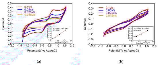 It was found that both the anodic peak current and the cathodic peak current increased as the scan rate increased, indicating a reversible electrochemical reaction of the [Fe(CN)6]4−/[Fe(CN)6]3− redox couple. At the same time, Figure 3 (insets) shows a brilliant linear relationship between the oxidation peak current (Ip) and the square root of the scan rate (v1/2), according to the following equation [21,30,31]: