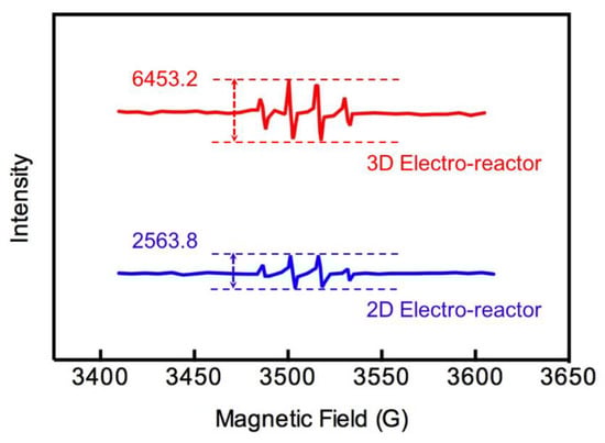 It is well known that the hydroxyl radical (·OH), of which the oxidation potential (2.8 eV) is the second highest and regarded as a powerful oxidizing chemical in nature, plays an important role in the electrochemical oxidation of RhB wastewater [35]. Therefore, the production of ·OH was detected by using the electron paramagnetic resonance (EPR) technique by adding the ·OH scavenger 5,5-dimenthyl,1-pyrroline-N-oxide (DMPO) to further reveal the underlying mechanism of the TOC and COD degradation of RhB wastewater. As expected, typical EPR spectra of the DMPO–·OH adduct with a 1:2:2:1 quartet were acquired in the 3D and 2D electro-reactors when current and voltage were applied, as shown in Figure 4. It is worth noting that the 3D electro-reactor achieved the higher EPR intensity, which was nearly 2.52 times higher than the corresponding value of the 2D electro-reactor and demonstrated that the electro-generation of ·OH occurred on the CGAC electrodes and the usage of the CGAC electrodes could enhance ·OH generation effectively in electrochemical oxidation processes [36].