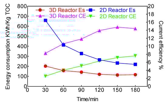 The CE and Es of the recycling-flow 3D and 2D electro-reactor systems are shown in Figure 5. Overall, the CE of the recycling-flow 3D and 2D electro-reactor systems both went up from 8.3% and 2.5% to 14.4% and 7.6%, respectively, and the Es of the recycling-flow 3D and 2D electro-reactor systems both decreased from 202.6 KW·h/kg TOC and 658.1 KW·h/kg TOC to 116.3 KW·h/kg TOC and 219.9 KW·h/kg TOC, respectively, during the electrochemical processes. The CE of the recycling-flow 3D electro-reactor system was always nearly twice as much as the corresponding value of the recycling-flow 2D electro-reactor system in the treatment period. Additionally, the lowest CE value of the recycling-flow 3D electro-reactor system, by the 30th minute, had reached 8.3%, which approximately equaled the highest CE value of the recycling-flow 2D electro-reactor system (7.6%).