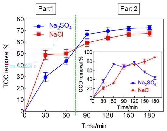 TOC and COD removal of RhB wastewater in the recycling-flow 3D electro-reactor system (NaCl and Na2SO4 as electrolytes, initial concentration is 2 g/L; RhB wastewater initial concentration is 100 mg/L; volume is 500 mL; initial pH is 7; voltage is 7 V; HRT is 20 min).