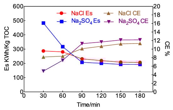Meanwhile, the Es of the recycling-flow 3D electro-reactor system with Na2SO4 was higher than the corresponding value of the recycling-flow 3D electro-reactor system with NaCl up to the 80th min. In particular, the Es of the recycling-flow 3D electro-reactor system with Na2SO4 was 483.5 KW·h/kg TOC, which was 68.3% higher than the corresponding value of the recycling-flow 3D electro-reactor system with NaCl (287.2 KW·h/kg TOC) by the 30th min. However, the Es of the recycling-flow 3D electro-reactor system with Na2SO4 started to be lower than the corresponding value of the recycling-flow 3D electro-reactor system with NaCl from the 80th min. In addition, the Es of the recycling-flow 3D electro-reactor systems with NaCl and Na2SO4 both declined to the lowest value (192.7 KW·h/kg TOC and 206.7 KW·h/kg TOC, respectively) in this period.