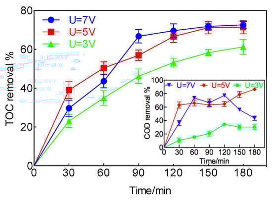 From the perspective of TOC, as shown in Figure 8, the TOC removal of RhB wastewater grew the most slowly and the final TOC removal just arrived at 61.0% when the voltage was 3 V. TOC removal was always higher with the voltages of 7 V and 5 V, and the highest values were basically equivalent (72.2% and 72.0%, respectively), which were nearly 1.18 times the corresponding value with the voltage of 3V.