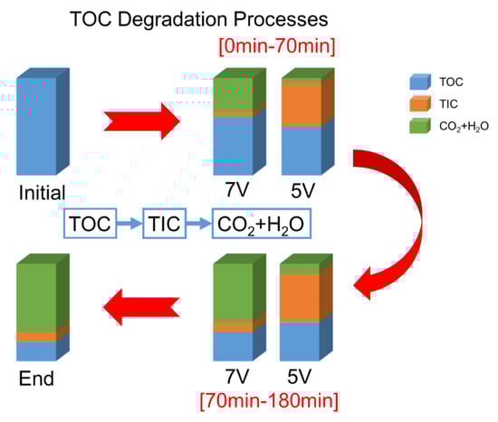 Interestingly, from the 0th min to the 70th min, TOC removal with the voltage of 5 V was higher than that with the voltage of 7 V. TOC degradation processes are illustrated in Figure 9. First of all, TOC was converted into TIC and then TIC was converted into CO2 and H2O. The concentration of ·OH in the RhB wastewater was higher, so that oxidation was stronger between the board electrodes with 7 V. TIC was quickly oxidized into CO2 and H2O and TOC was converted into TIC as main processes. With the voltage of 5 V, the oxidation was weaker [40,41,42]. Electron transfer processes were normally used to convert TOC into TIC whilst only some of TIC was converted into CO2 and H2O. Hence, TOC removal was higher with 5 V. After the 70th min, TOC removal with the voltage of 7 V was beyond the corresponding value with the voltage of 5 V. TIC from TOC was basically converted into CO2 and H2O with the voltage of 7 V, while TIC just started being rapidly converted into CO2 and H2O as main processes with the voltage of 5 V. Hence, TOC removal was higher with 7 V. The final TOC removal with 7 V was slightly higher than the corresponding value with 5 V since the potential of 7 V was higher than 5 V up to the 180th min [43,44].