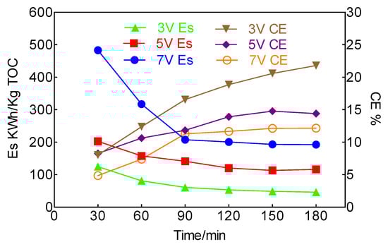 CE with the voltage of 3 V rose the fastest from 8.0% by the 30th minute to 21.8% by the 180th minute, which increased by nearly two times, meanwhile, the CEs with 5 V and 7 V both showed gradually increasing trends to 14.1% and 12.2%, respectively, as indicated in Figure 10. Plus, the Es with different voltages (3 V, 5 V, and 7 V) gradually decreased by 63.1%, 42.6%, and 60.2%, respectively, from the 30th min up to the 180th min. In the whole electrolysis process, the higher the voltage was, the higher the Es was. At the 180th min, Es with the voltage of 3 V was 46.1 KW·h/kg TOC, which was 39.6% of the corresponding value with 5 V (116.3 KW·h/kg TOC) and 23.9% of the corresponding value with 7 V (192.7 KW·h/kg TOC).