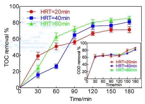COD removal curves were almost growing coincidently at different HRTs (20 min, 40 min, and 60 min), as illustrated in Figure 11. Finally, COD removal (86.9%,) at HRT = 20 min was slightly higher than the corresponding values at HRT = 40 min (80.1%) and HRT = 60 min (83.4%). This indicated that HRT had little effect on the degradation of COD in the RhB wastewater.