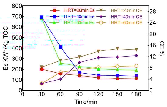 The CE at HRT = 20 min (8.3–14.8%) was always higher than that at HRT = 40 min (CE: 2.4–12.4%) and HRT = 60 min (CE: 2.5–8.7%), as shown in Figure 12. The maximum CE (14.8%) at HRT = 20 min was 1.2 times and 1.7 times the corresponding values at HRT = 40 min (12.4%) and HRT = 60 min (8.7%), respectively. From the perspective of Es, Es at HRT = 20 min was always lower than that at HRT = 40 min and HRT = 60 min, and the minimum Es at HRT = 20 min, 40 min, and 60 min were 116.3 KW·h/kg TOC, 135.3 KW·h/kg TOC, and 192.4 KW·h/kg TOC, respectively.