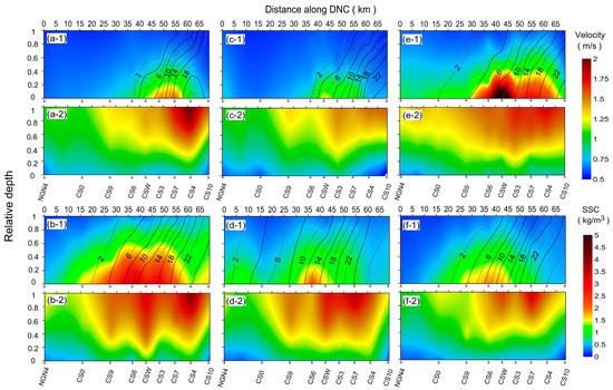 The CSW station located at the middle DNC, where severe siltation exists. The time series of water level, current velocity, salinity and SSC at CSW within two flood-ebb tidal cycles are illustrated. The currents reversed to flood/ebb ~1–2 h after the low/high water level (Figure 3(a-1–f-1)), the phase difference between the current and water level is caused by the combination of friction and channel convergence [39]. The flood and ebb currents showed significant tidal asymmetry in terms of current velocity and duration (represented by time periods between white color bars in Figure 3(a-1–f-1)). Due to the large river discharge and the effect of the DNC project, the ebb currents were much stronger and had longer durations than the flood currents. The durations of flood currents were shorter at the surface than the bottom, while the ebb currents showed the opposite. The vertical asymmetry of the current duration was induced by baroclinic pressure gradient force. This force has the same direction as the flood current and increased with the water depth [15,39]. By the same token, the flood current speeds were more homogeneous along the depth compared with the ebb currents.