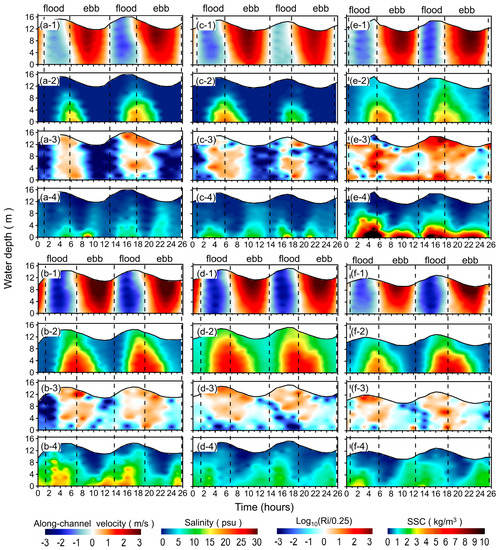 Variations of along-channel current, salinity, stratification and SSC during two flood-ebb tidal cycles at CSW: (a–f) represent six observations respectively (according to Figure 2). (1–4) represent along-channel current velocity, salinity, gradient Richardson number and SSC, respectively. Positive velocity denotes seaward current, and negative velocity denotes landward current.
