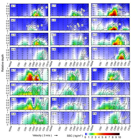 Variations of axial current, salinity and SSC along the DNC: The (a–f) represent six observations, respectively (according to Figure 2). (1–4) represent peak flood, high water slack, peak ebb and low water, slack respectively. The rightward arrow means seaward axial current, and the leftward arrow means landward axial current. The isohalines (in psu) are shown in black lines.
