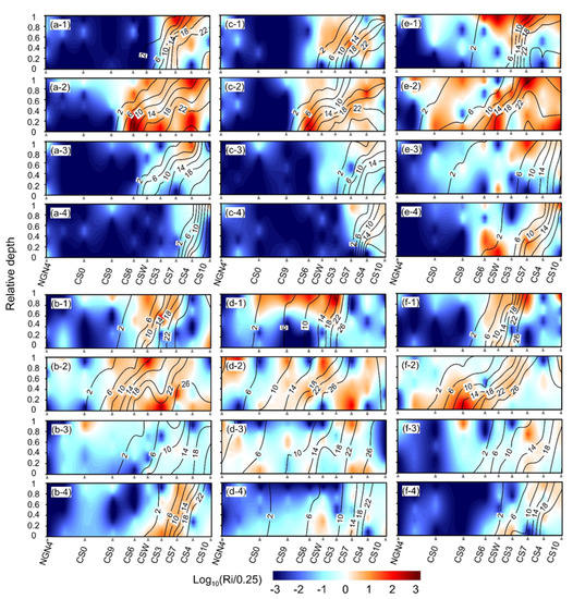 The gradient Richardson number () is commonly applied to study the stratification and mixing in estuaries [36,37]: