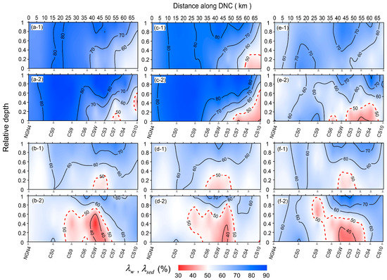 Percentages that ebb water/sediment transport account for the total water/sediment transport along the DNC: (a–f) represent six observations, respectively (according to Figure 2). (1)—and (2)—represent water transport and sediment transport , respectively. The red dashed lines represent the value 50%. Values >50% denotes ebb-dominated and seaward residual transport, while values <50% denote flood-dominated and landward residual transport.