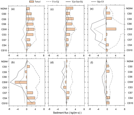 Components of total sediment fluxes at along-channel stations: The (a–f) represent six observations, respectively (according to Figure 2). is the advection term, is the tidal pumping term and is the vertical circulation term. Positive values denote seaward terms, and negative values denote landward terms.