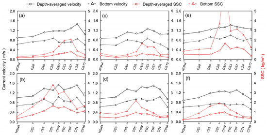 Along-channel distributions of tidal-averaged bottom current velocity, SSC and depth-averaged current velocity, SSC: The (a–f) represent six observations respectively (according to Figure 2). The averaged current velocity magnitudes in the figure were calculated by absolute values of current velocities over two flood-ebb tidal cycle and denote the strength of tidal dynamic.