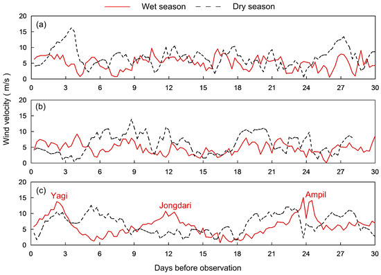 Wind speeds near NPJ station before observations: (a–c) represent 2016, 2017 and 2018, respectively.
