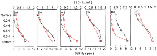 Vertical profiles of tidal-averaged SSC and salinity at CSW: The red line represents SSC, and the black line represents salinity. The (a–f) represent six observations respectively (according to Figure 2).