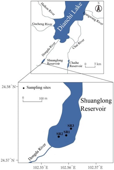 The Shuanglong reservoir is a typical water-supply reservoir which was built in 1956. It is located in Jinning County, Kunming, China, and belongs to the Dianchi watershed. The reservoir has a total watershed area of 54 km2, a storage capacity of 1216 m3, and a maximum water depth of 19 m. The terrain of the reservoir area is relatively flat, with a length of 1.5 km and a width of 80–100 m. The Shuanglong drainage network is one of the main water systems which flows into Dianchi Lake. Generally, the rainy season is from June to October, which accounts for about 75% of the annual rainfall, and the maximum annual rainfall is 1243.8 mm. The watershed belongs to a subtropical monsoon climate. The soil types are dominated by red soil, purple soil, and paddy soil. The agricultural land is mainly used for planting corn, beans, and rice. Early development and serious anthropogenic destruction have resulted in the scarcity of native vegetation, with the major vegetation types currently being Yunnan pine forest, shrub initiation, and shrub-grassland.