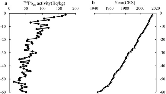 The dating methods for the sediment cores based on 210Pbex activity mainly included the constant initial concentration (CIC) model and the constant rate of supply (CRS) model. The 210Pbex activity is relatively volatile in the Dianchi watershed, presumably due to anthropogenic activities in recent decades. Thus, the CRS model was adopted to establish the chronological sequence of the sedimentary cores [21]. The equation of the CRS model is as follows