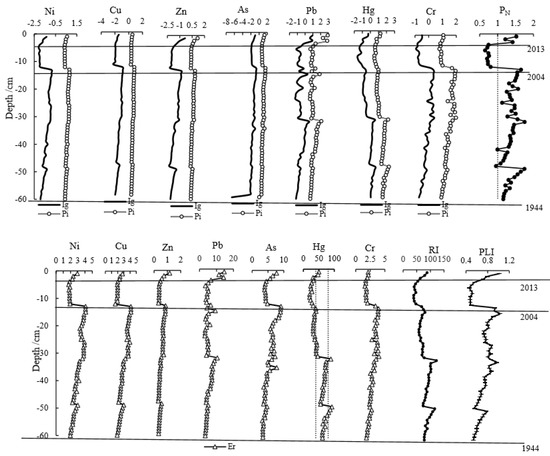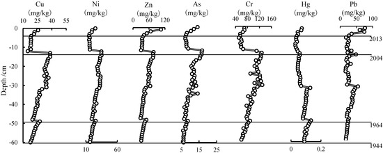- 1944–1964 (−60~−49 cm). This stage covers the earliest years of the People’s Republic of China. The heavy metal content was generally low and rising, and the contents of As, Cr, and Hg fluctuated slightly;