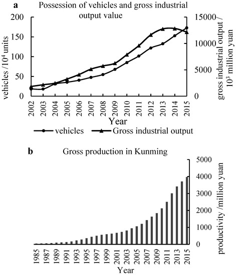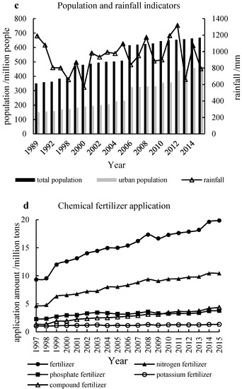 The possession of vehicles and gross industrial output (a), gross production (b), total population, urban population and rainfall (c), and crop fertilization (d) in Kunming over time.