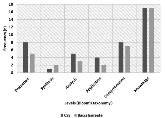 Once again, the levels of knowledge (47.22% of incidence) and comprehension (19.44% of incidence) are the most demanded. The evaluation level follows with 13.88% of the cases in baccalaureate, although, as in secondary education, the level of evaluation required of baccalaureate students is far from adequate. The two cognitive levels least in demand from baccalaureate students are the level of application and the level of synthesis, with a 5.55% incidence in both cases.
