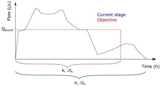 The flow injected into the network is the parameter to be optimized here. It is widely known that constant flows injected into the PIN (always meeting pressure restrictions) involve minimum energy consumption. In this stage, we calculate the (through the total simulation time ) and we aim to supply the same volume with a constant flow (the lower threshold flow rate, Figure 1). With this new data, the new simulation time should be Equation (3).