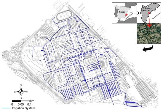 To explain this procedure, we analyze the programmed sprinkling device used for watering the garden of the University of Alicante, SE Spain (38°23′4.06″ N, 0°30′44.06″ W; Figure 1), (Figure 3; Case 0). The irrigation zone of this garden has grown through time, and the gardeners have included new species to the grass meadow (i.e., Festuca arundinacea and Poa annua). We divided the plot into hydro-zones grouped corresponding to the landscape coefficient method depending on water needs and crop evapotranspiration values. For the months of greatest water need, overall water needs are 1.7 and 3.9 L·mm−2·day−1, comparable to the water use of the least and most exposed areas of the garden.
