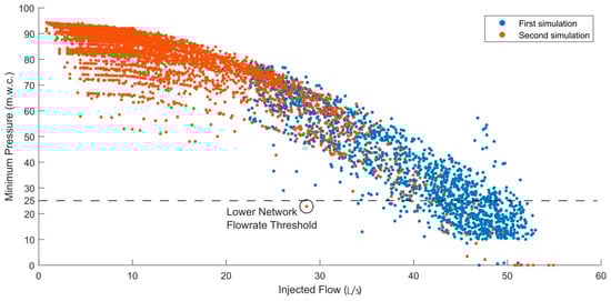 To test the relationship between the smallest pressure and inlet flow, we worked out 15,000 simulations (Figure 5). In each of the simulations, we open several hydrants and subunits. The inlet flow rates then followed differs from 0 to 50 L/s (the number of expenditure nodes opened reaching from one to 160). The lower network flow rate threshold is 28.57 L/s (the smallest flow rate that may encompass at least pressure below 25 MWC, marked in black in Figure 6) and the upper network flow rate threshold is 51.37 L/s (the greatest flow rate for which we can maintain pressure specifications). We have performed the 15,000 simulations using random consumption values for the irrigation pressurized network. We consider the potential risk of combining several valves opening involving pressures below the required by standards = 25 m. w; (c) The graph in brown is the latest 5000 simulations performed among the specific values among the upper and lower threshold flow rates.