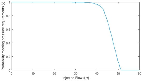 In the flow rates among 25.56 L/s and 51.37 L/s, we found 1550 simulations, 1100 of them successful. We may get the probability of meeting pressure conditions if we combine flow with the 450 unsuccessful simulations. If the flow rate is above 28.57 L/s, the probability of not matching the pressure standards is 1/450 (or 1 − 1/450 = 99.77% of matching), and later the flow rate is above 3408 L/s (the second combination under pressure standard) the probability of not meeting the standards is 2/450 (or 1 − 2/450 = 99.55% of meeting them). Extrapolating this, we identify the relationship between probability and flow rate (Figure 6).