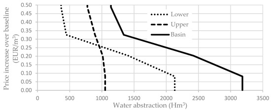 The baseline price for irrigation is 0.06 EUR/m3 (Table 1) with a variable tier of approximately 30% (0.02 EUR/m3) and the rest as a flat rate. The agricultural sector’s response to water pricing has been simulated by adjusting irrigated crop area (internally) and converting irrigated areas into rainfed crops when the water price causes irrigation to be halted. This is an oversimplification since certain intra-sector intra-regional water trade may be possible, but this option remains outside the scope of this analysis.