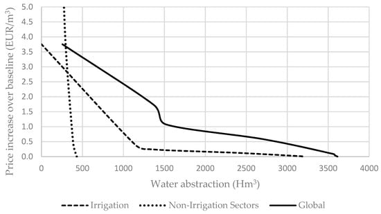 Figure 3 shows the integration of demand curves (water use vs. water price) of irrigated agriculture and the remaining economic sectors (non-irrigation), as well as the global (integrated) demand curve of the GRB. In this case, water abstraction excludes the inflow uses of energy (hydropower generation) and navigation uses. Hydropower has a lower priority in the GRB, since water is turbinated only when it is released for the interest of the other sectors, including environmental uses. Therefore, water available for hydropower is a by-product of decisions taken by the regulator in order to supply water to other sectors. In the case of navigation, this use is limited to the lower part of the GRB from the Atlantic Ocean near to Doñana National Park up to the inner-port of the city of Seville [13].