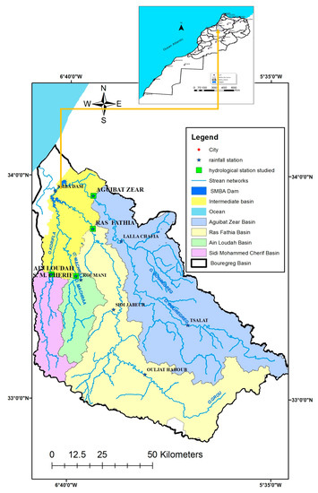 The Bouregreg Basin, located in central western Morocco, covers a total area of approximately 10,130 km² at its mouth in the north of the city of Rabat (Figure 1). The main rivers of the basin are the Bouregreg, the Grou, and the Korifla and its tributary, the Machraa.