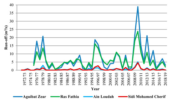 With the exception of the Korifla sub-basin at the right of the Ain Loudah station which recorded a surplus of nearly 24% during 2017/2018, the contributions were in deficit on the rest of the sub-basins during the two hydrological years with more pronounced deficits during the dry year 2016/2017. Table 7 summarizes the inflows recorded at the four stations of the study.